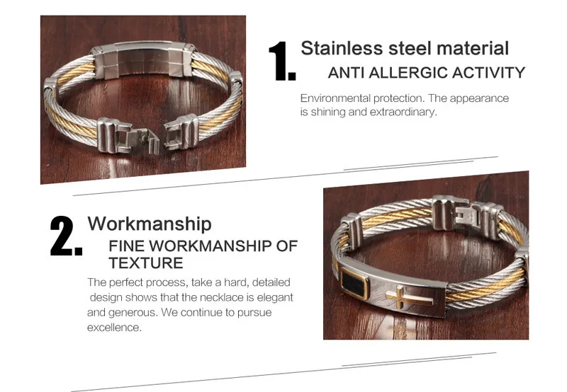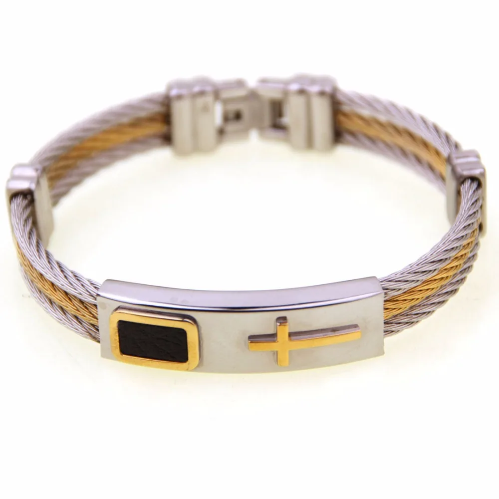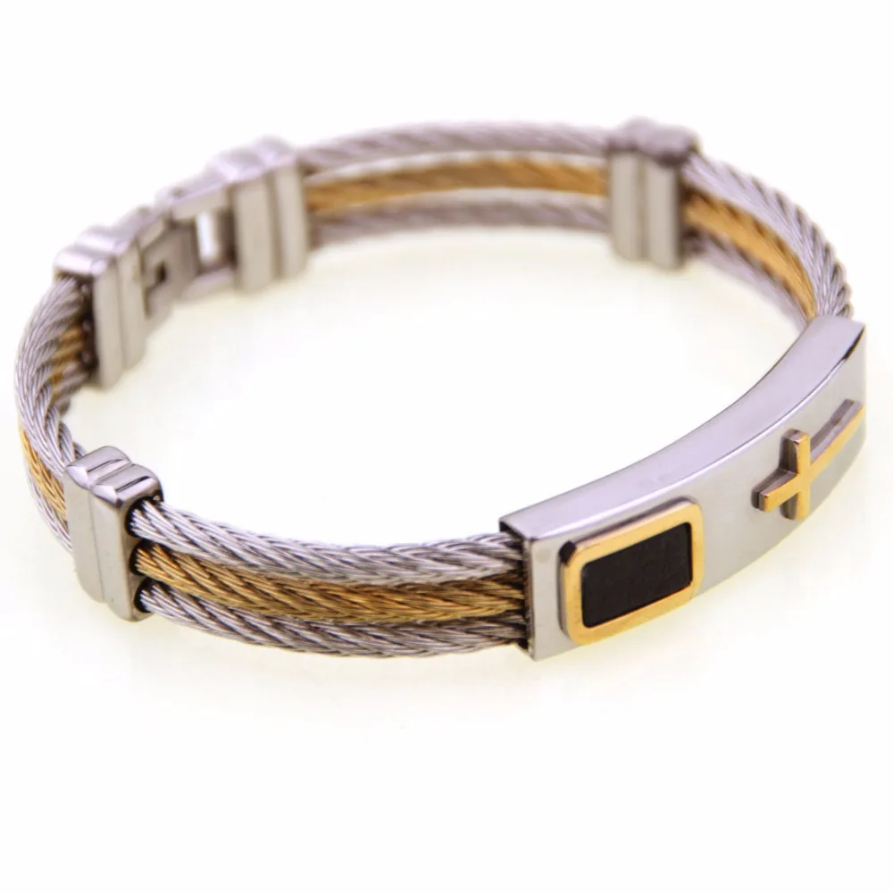 Fashion Male Twisted Color Gold Stainless Steel Jesus Cross Charm Cuff Cable Wire Bracelets Jewelry For Men